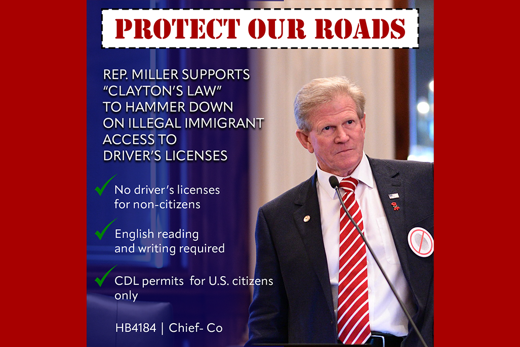“We must enforce laws that protect Illinois citizens and prioritize keeping our roads safe,” said Rep. Miller. “We continue to see tragedies occur on roads in our communities due to illegal immigrants driving without knowledge of our laws. To keep Illinois citizens safe, we must set strict guidelines on who can obtain a driver’s license and have all applicants prove they understand English, which is why I support HB4184.”