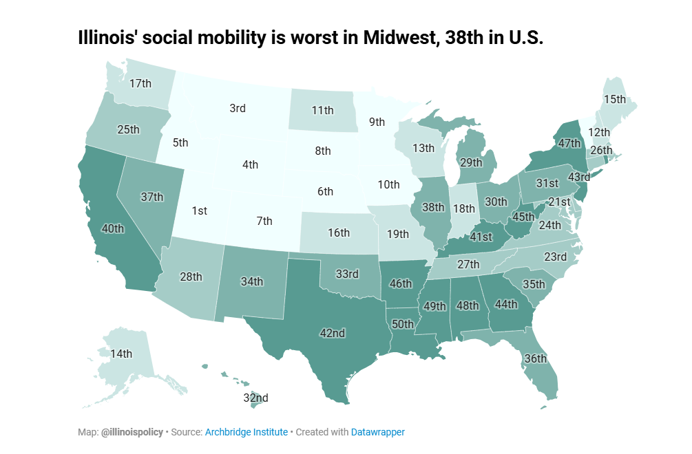 Illinois placed 38th nationally for social mobility. Its rank was pulled down by economic problems and corruption in its legal system.